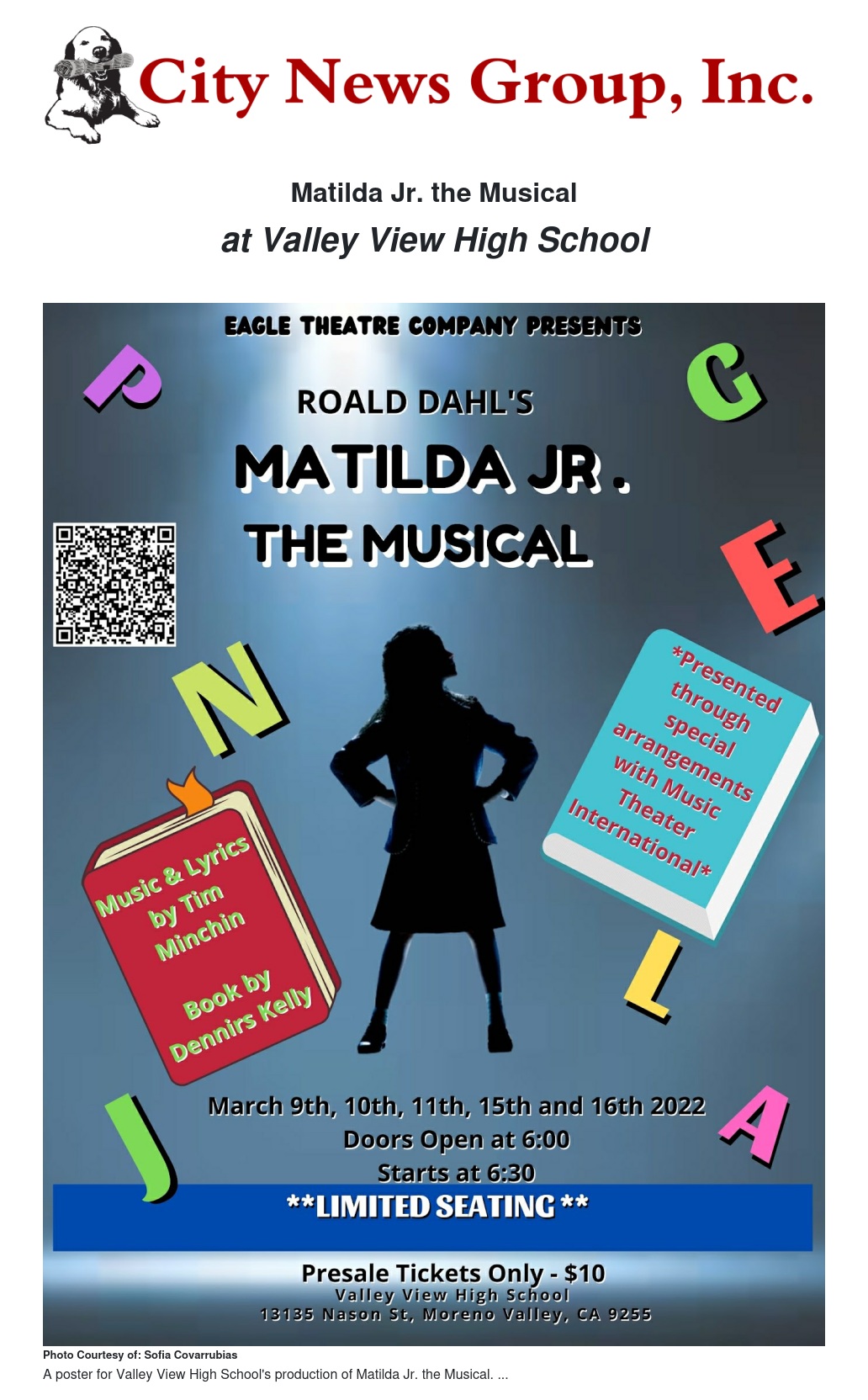 Eagle Theatre Company presents Roald Dahl’s Matilda Jr. the Musical on March 9-11, 15, and 16 of 2022 at 6:30 PM at Valley View High School, 13135 Nason St, Moreno Valley, CA 92555. Tickets are $10 per person and are pre-sale (Not sold at the door per Covid-19 protocol). In order to purchase tickets, please go to Valley View High School’s web store at https://valleyviewhs.myschoolcentral.com/, then click the “Product Categories” drop down, then select “Drama”, and then “Drama Musical - Matilda Jr.” If you need help purchasing the tickets or would like more information regarding the show, feel free to email our VVHS Theatre Director, Ms. Lopez, at jeanine.lopez@mvusd.net.
