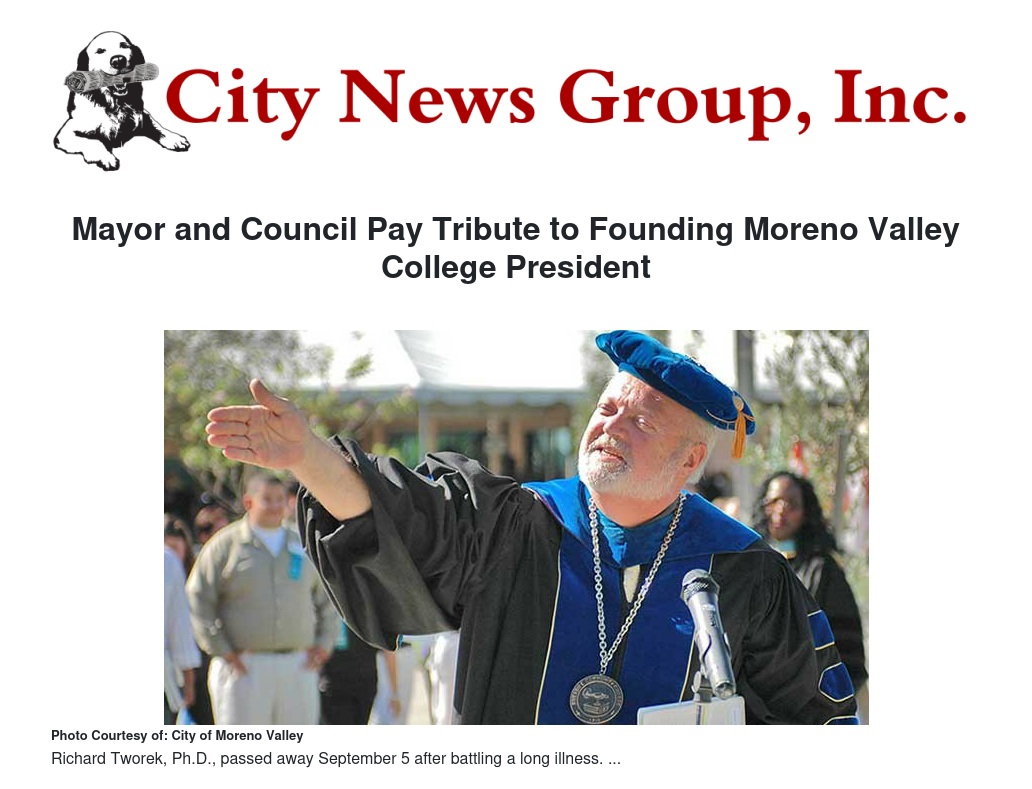 Moreno Valley Mayor Yxstian Gutierrez adjourned Tuesday’s City Council Meeting in honor of Richard Tworek, Ph.D., the founding President and Provost of Moreno Valley College who passed away September 5 after battling a long illness.