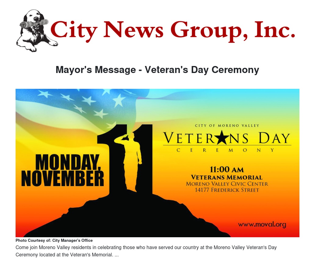 I am so proud that my hometown welcomes and values the brave men and women who have stepped forward to defend our people and our Constitution. We will pay tribute to our military veterans at the City’s 12th annual Veterans Day Ceremony on Monday, November 11.