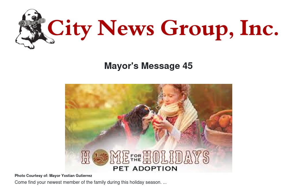 Our animal shelter is holding our Home for the Holidays Adoption Event from Tuesday, November 13 through Thursday, November 15 and Tuesday, November 27 through Thursday November 29. Adoptions will be held from 10 a.m. to 5:30 p.m.