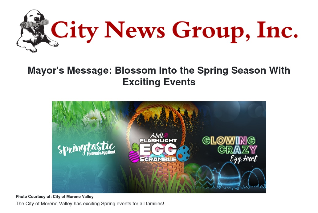 It may not seem like it due to the recent cold weather, but spring is around the corner in Moreno Valley. As the poppies bloom on Box Springs Mountain, our city will come alive with exciting spring events for all our families.