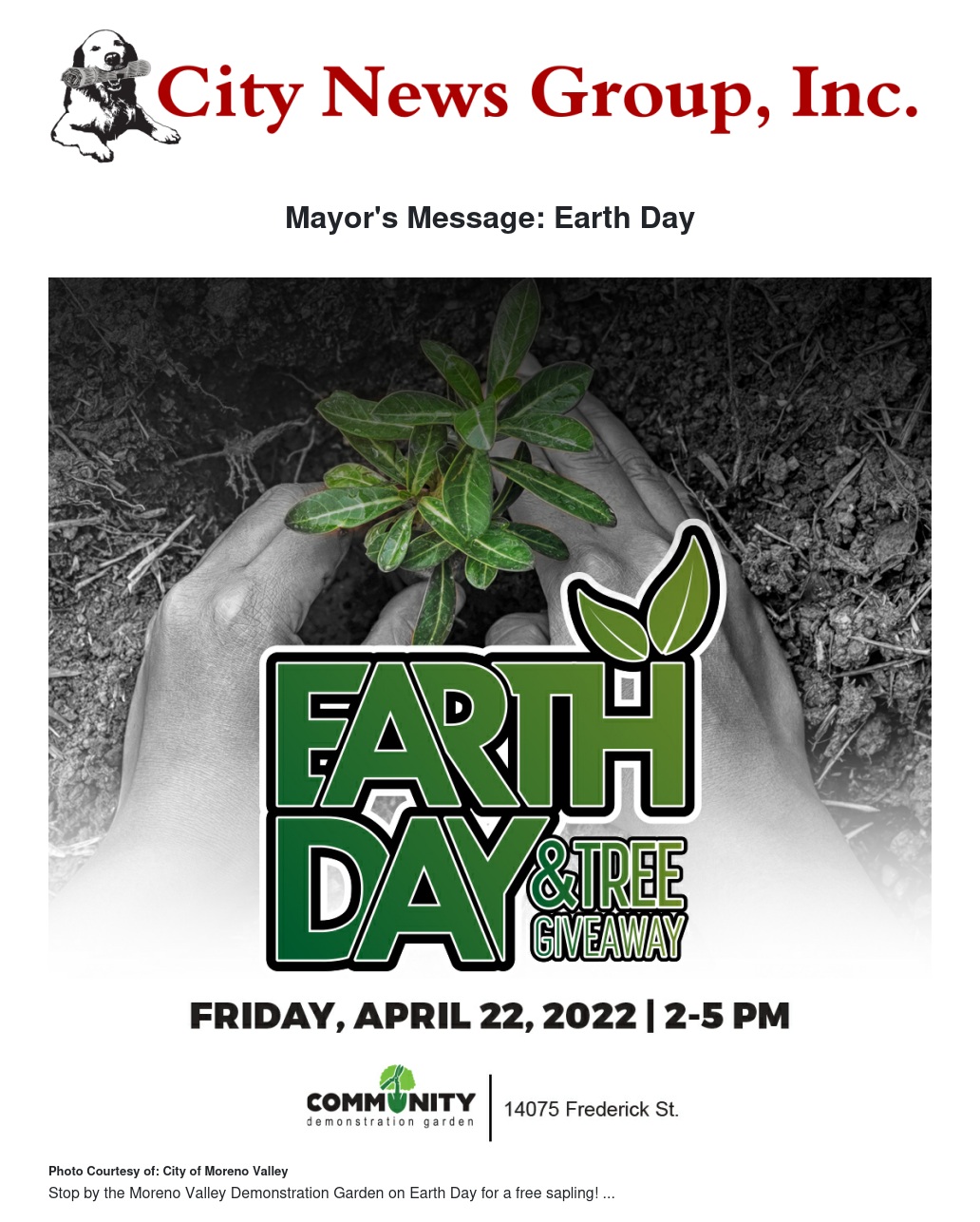 On April 22, Earth Day itself, stop by the Moreno Valley Demonstration Garden to receive a free sapling that will be a welcome addition to our ecosystem of tens of thousands of trees.