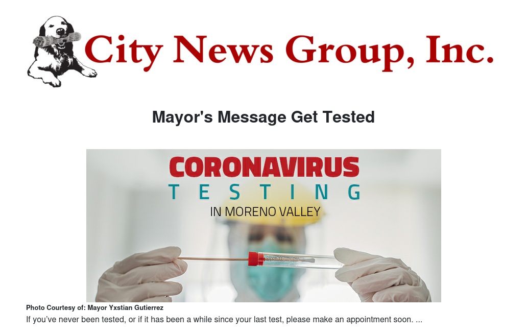 As I write this week, more than 5,000 Californians have died of Covid-19, 31 of them here in Moreno Valley. Now that coronavirus testing is finally available locally, however, we have a chance to better fight back by identifying where the virus is. As Mayor, I join with health professionals in urging all residents to take advantage of the testing sites we have in Moreno Valley and nearby. Every test helps further isolate the virus.
