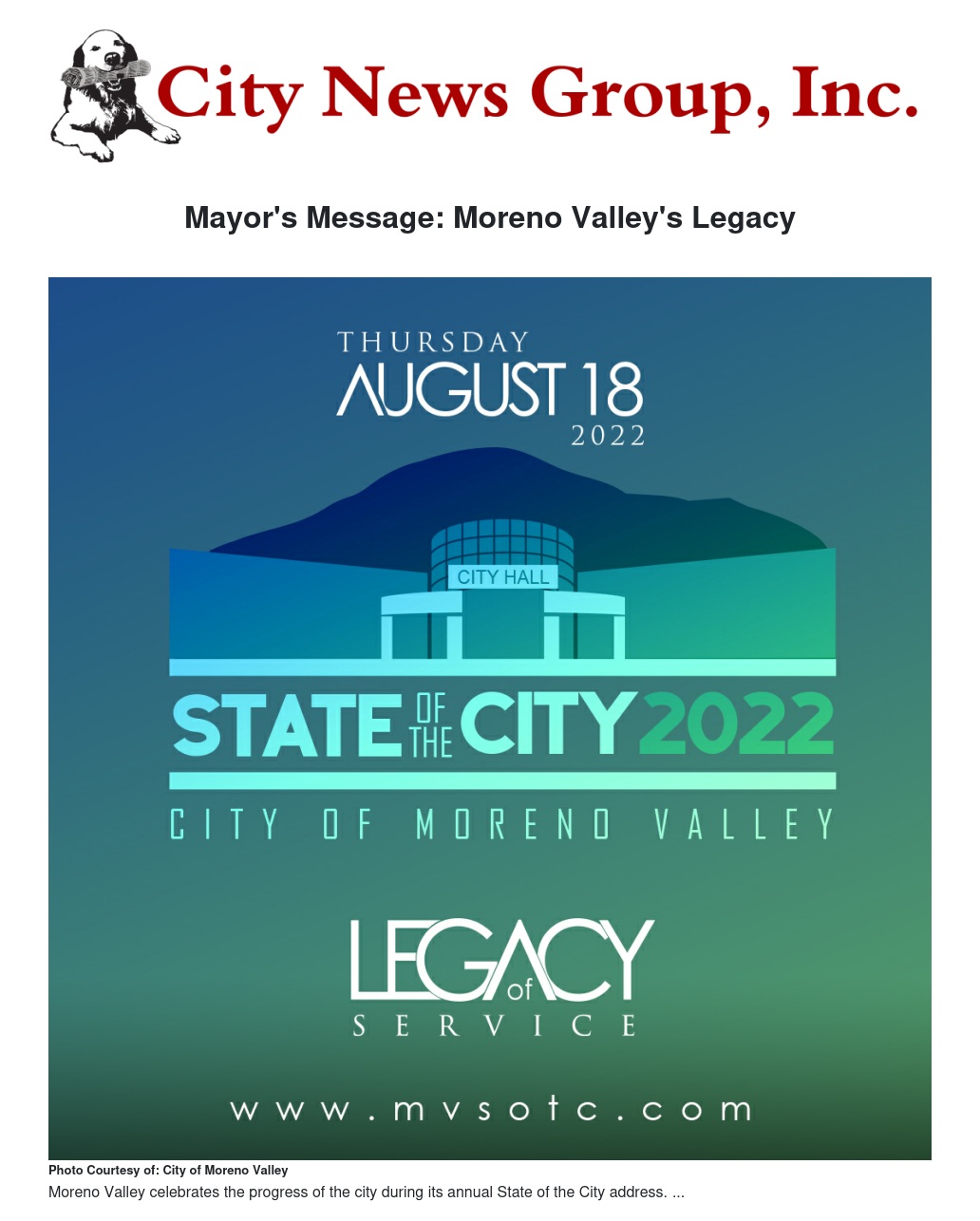 I invite you to join me, the Moreno Valley City Council, and dignitaries across Riverside County as we hold the annual State of the City address on Thursday, August 18, at 11 a.m.