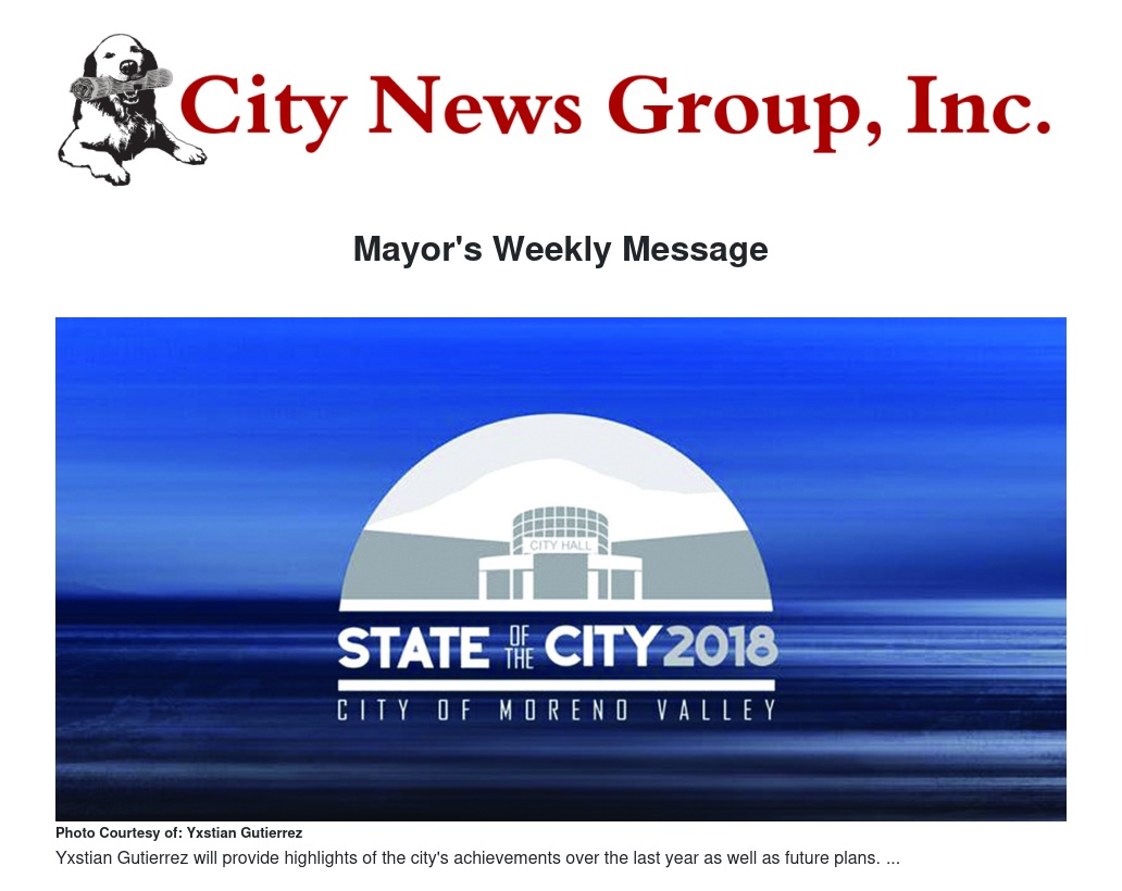 Dear Moreno Valley residents: The 2018 State of the City is next Wednesday, August 22, at the Conference and Recreation Center. Reserve your tickets for this highly anticipated event today!
