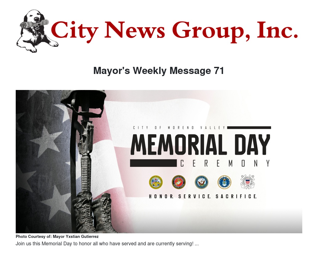 It is my honor to once again preside over the City of Moreno Valley’s Memorial Day Ceremony, which recognizes America’s greatest heroes. Please join me at this year’s ceremony to pay tribute to the military men and woman who have laid down their lives defending our freedom.