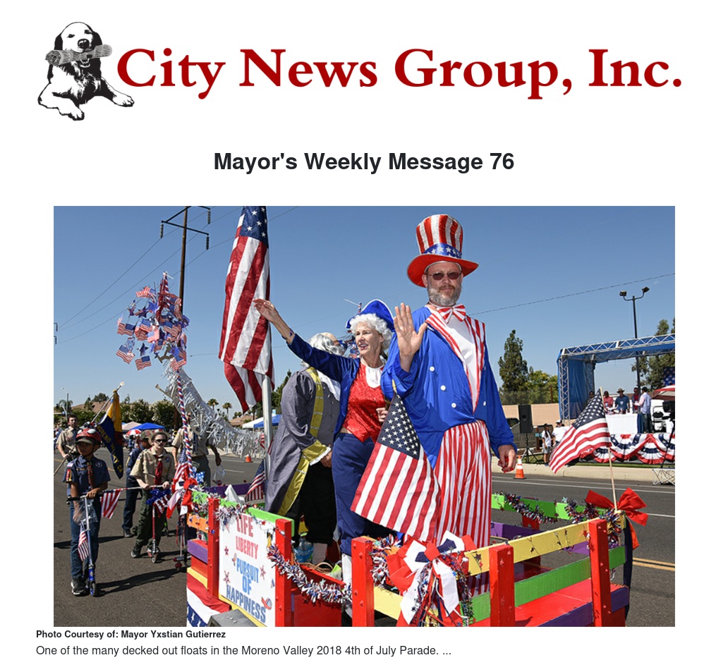 As your Mayor, it is my honor to invite all residents of Moreno Valley to celebrate America and our shared patriotism at our signature 4th of July Parade and Family FunFest, two of the best-attended Independence Day events in the Inland Empire.