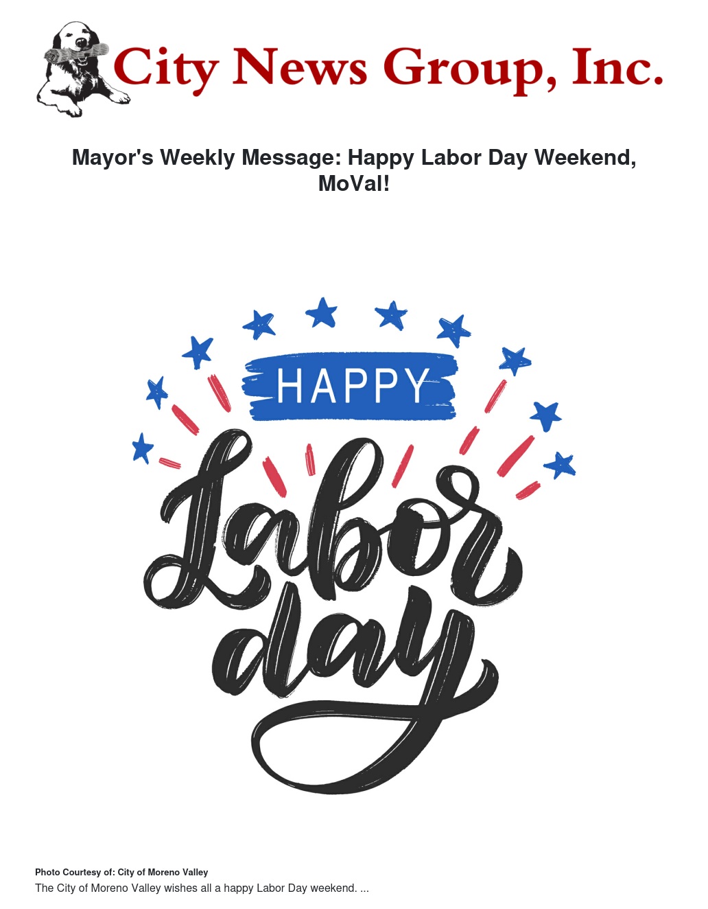 On behalf of all of us at the City of Moreno Valley, I hope you have a wonderful Labor Day weekend.