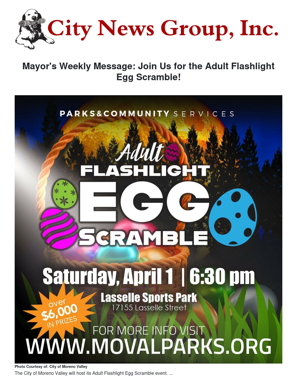 This year, we have a special Spring event for grown-ups—The Adult Flashlight Egg Scramble on Saturday, April 1, from 6:30 p.m. to 9 p.m. at Lasselle Sports Park.