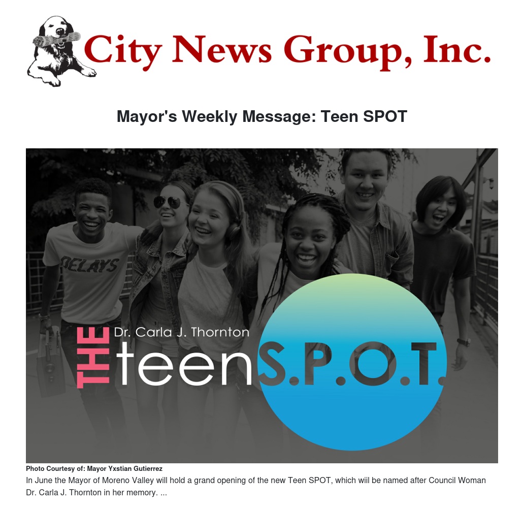 In June, I'll be hosting the Grand Opening of a new after-school space at the City's Conference & Recreation Center for teens, providing Support, Programs, Opportunity and Technology outside of school – the Teen SPOT.