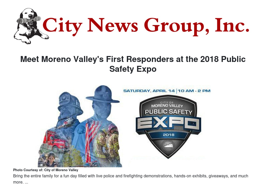 Mark your calendar for the City of Moreno Valley’s 5th Annual Public Safety Expo on Saturday, April 14 from 10 a.m. to 2 p.m. at the Moreno Valley Civic Center.