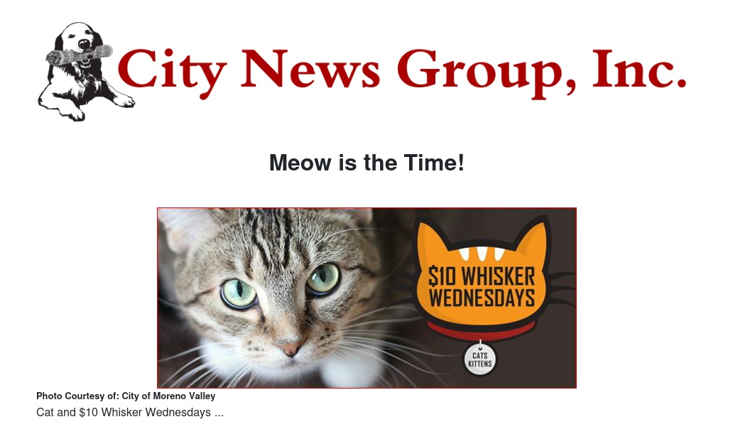 Every Wednesday in July, cats and kittens will be only $10 to adopt during Whisker Wednesdays at the Moreno Valley Animal Shelter! This price includes spay and neuter surgery, vaccines, and the HomeAgain microchip.
