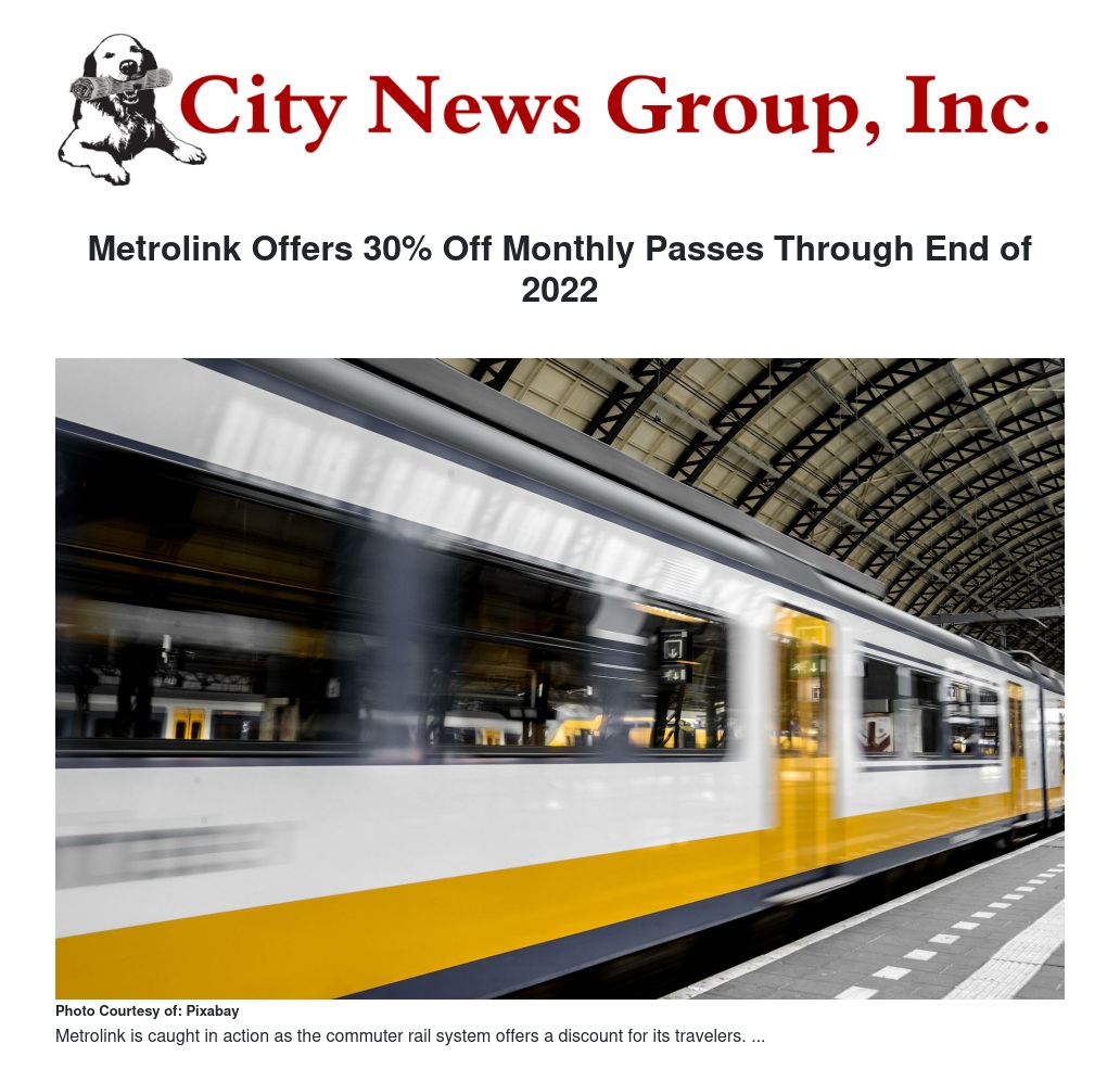 In celebration of its upcoming 30th anniversary on Oct. 26, Metrolink has introduced a 30 percent sale on its Monthly Pass. The 30% discount is open to all Metrolink riders for three months – October, November, and December 2022 and is automatically applied at purchase.