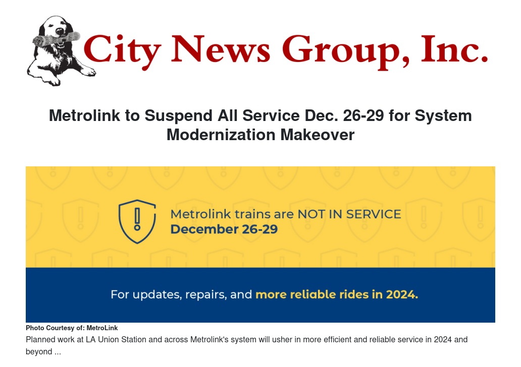 Metrolink to Suspend All Service Dec. 26-29 for System Modernization Makeover by MetroLink - City News Group, Inc.