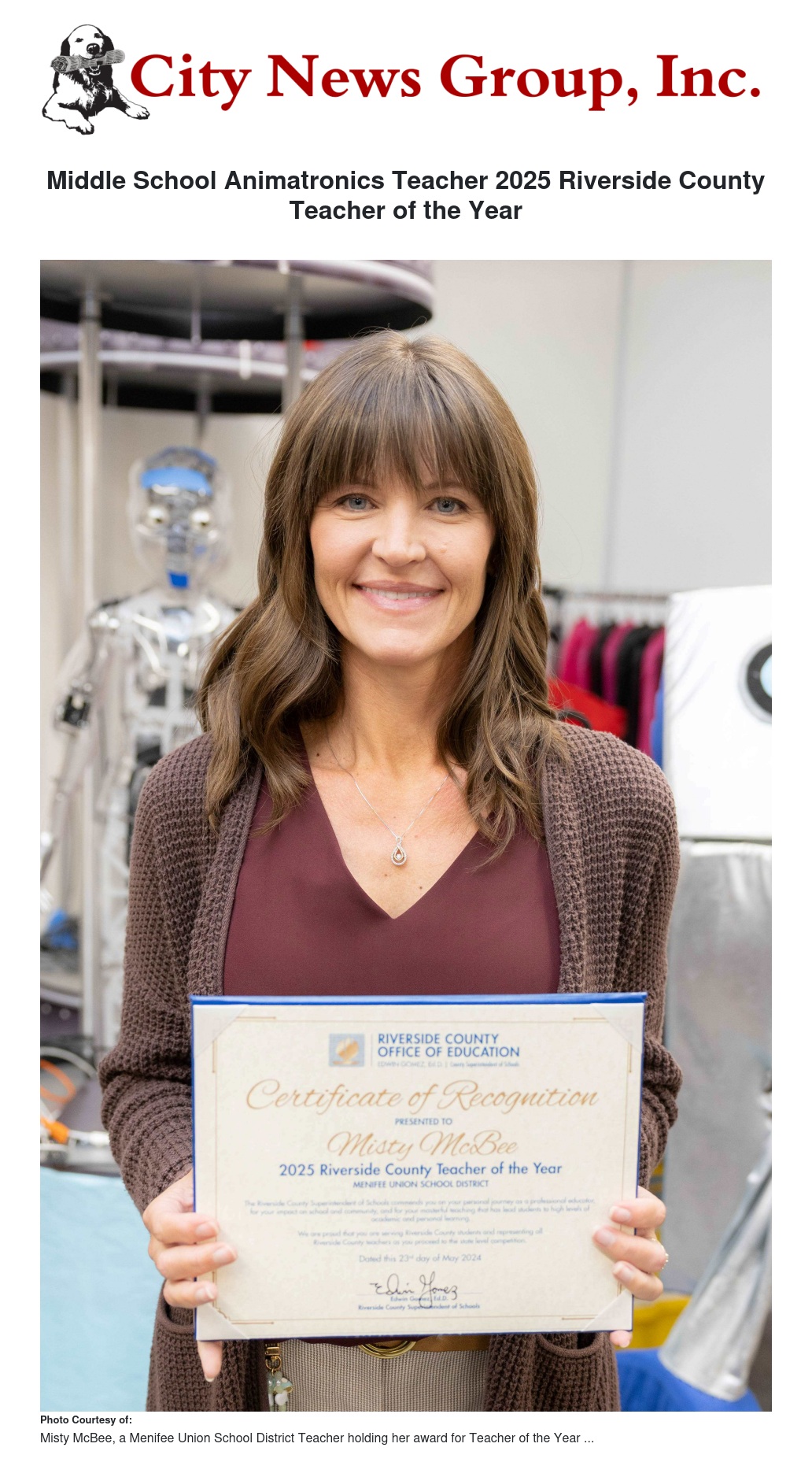 Over the years, surprise visits naming the Riverside County Teachers of the Year have taken place in auditoriums, gyms, libraries, and classrooms of all shapes and sizes where subjects from math and English to science and automatic technology are taught. On Thursday, May 23, Riverside County Superintendent of Schools, Dr. Edwin Gomez, stepped into a middle school classroom at Harvest Hill STEAM Academy in Menifee Union School District to name animatronics teacher Misty McBee, as the final 2025 Riverside County Teacher of the Year, and the first animatronics teacher in the county to receive that honor.