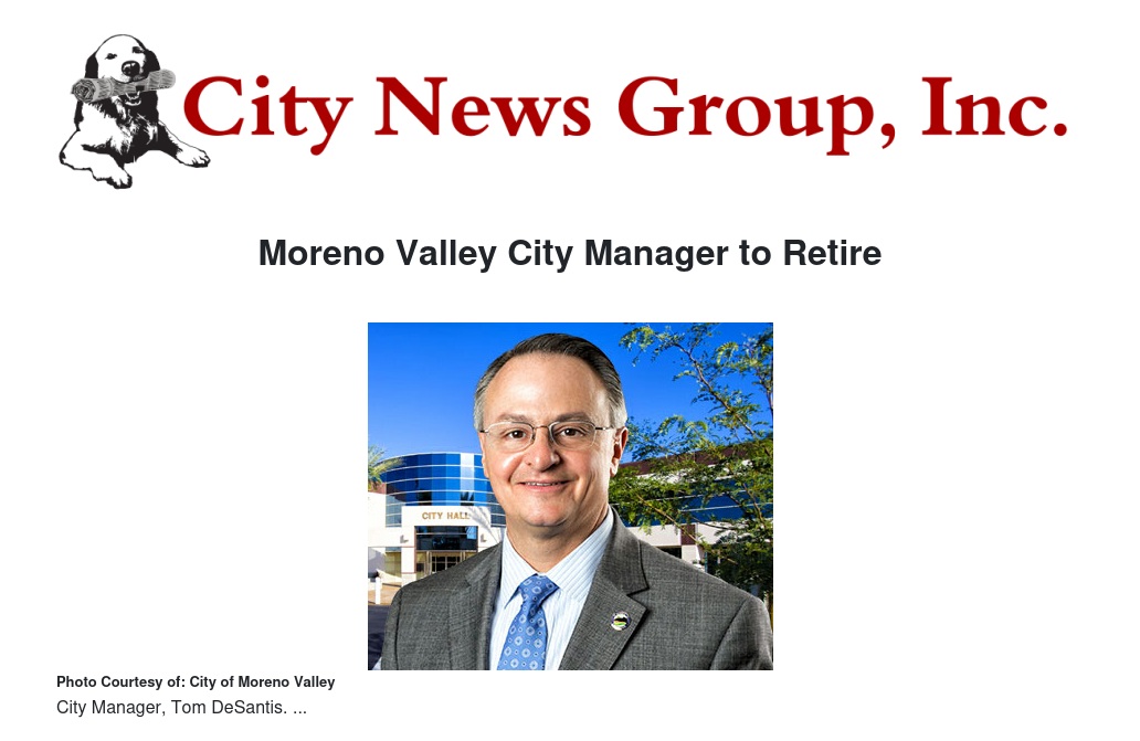 The Moreno Valley City Council tonight accepted notice of City Manager Tom DeSantis’ retirement. He will depart this month.