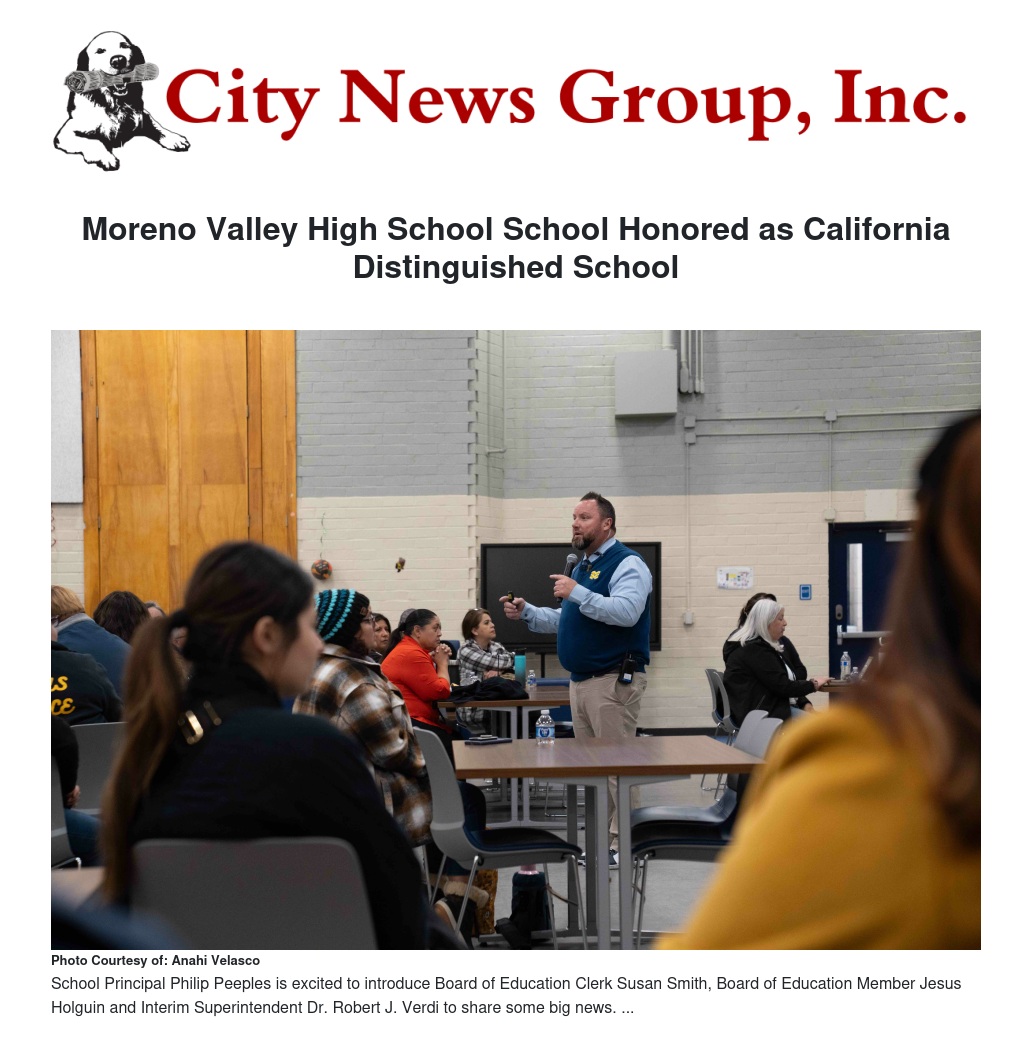 Moreno Valley High School School Honored as California Distinguished School by Anahi Velasco - City News Group, Inc.