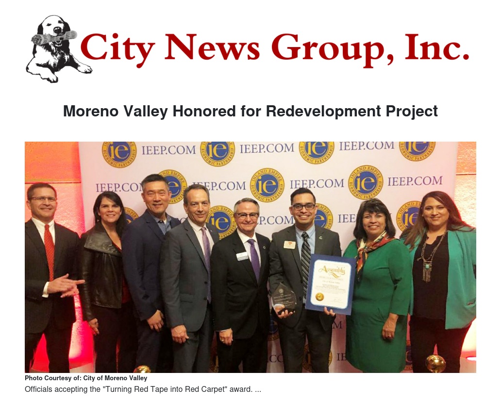 Moreno Valley officials were proud to accept two "Turning Red Tape into Red Carpet" awards recently from the Inland Empire Economic Partnership (IEEP) for the city's redevelopment and small-business assistance efforts. The annual awards recognize cities, counties and agencies for their business-friendly practices and job-creation efforts.