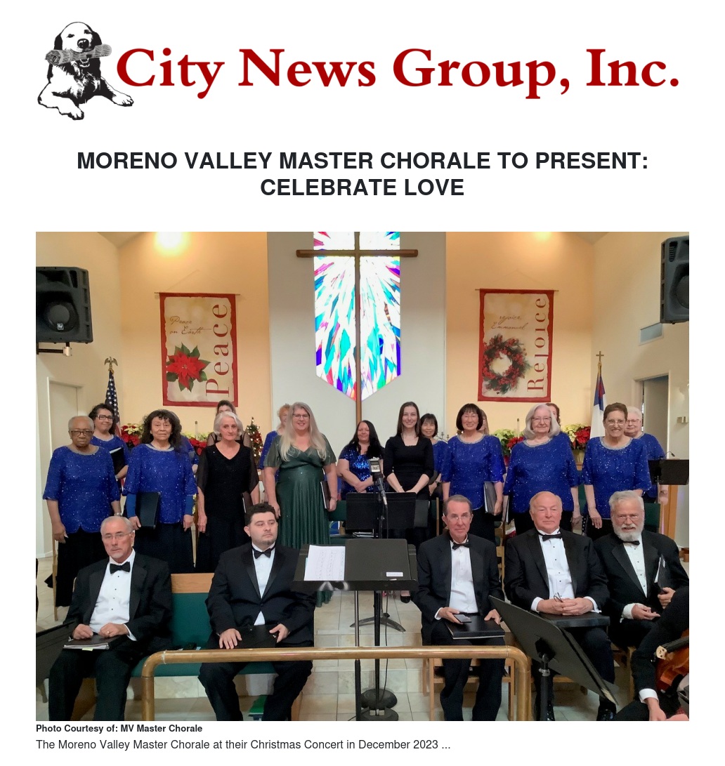 On Sunday, June 9, 2024 at 4:00 P.M., the Moreno Valley Master Chorale will present “CELEBRATE LOVE,” a pops concert at the Shepherd of the Valley Lutheran Church, 11650 Perris Blvd. in Moreno Valley. This lighthearted trip through the joys and perils of love will feature our wonderful Chorale soloists, as well as our amazing accompanist, Jonathan Keplinger. Highlights of the concert will include favorites from Andrew Lloyd Weber’s Phantom of the Opera, “Think of Me” sung by Natalie Artinian, and “Love Changes Everything,” by the Chorale ensemble. Popular selections from West Side Story to be performed are, “Tonight” and “Somewhere.” Some of the other melodies to be presented by Chorale soloists will include, “Tightrope” from The Greatest Showman, sung by Mary Garrison, and “Ten Minutes Ago” from Cinderella performed by Liora Gheorghe. Bethany Wilson will sing “Can’t Help Lovin’ That Man of Mine” from the musical, Showboat. The Chorale will round out the program with “Never My Love,” “Plaisir d’Amour,” “Somebody Loves Me,” and many other beautiful love songs from the repertoire, highlighting the ups and downs of romance. Hope to see you there. Tickets (cash only) are available at the door: Adults--$15.00; Seniors—$10.00; and Students are free with ID. For more information please call 951-485-8414 or 951-242-4963, or go to our website at www.morenovalleymasterchorale.org.