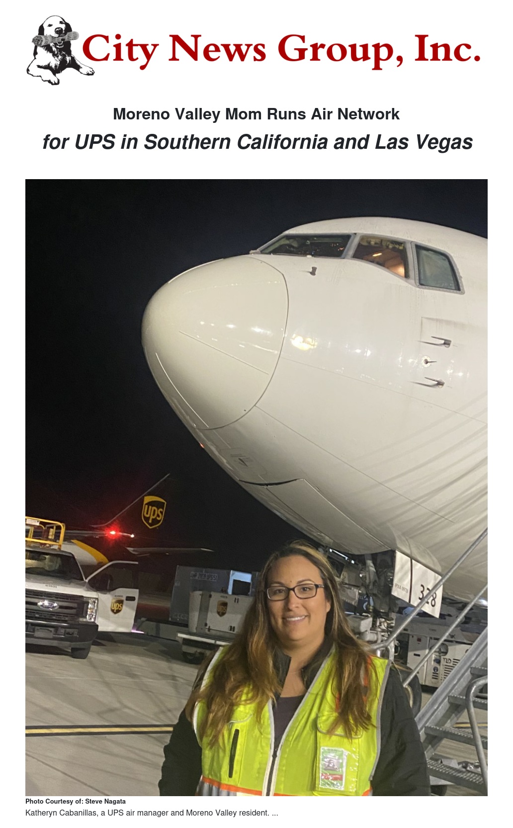 Katheryn Cabanillas, from Moreno Valley, is a UPS air manager responsible for all the next and second day air volume that travels on 70 aircrafts through Southern California and Las Vegas air gateways (excluding Ontario). She manages a seven-day operation, has more than 630 employees, and oversees all air operations in and out of Burbank, Las Vegas, Long Beach, Los Angeles, Orange County, San Bernardino, and San Diego airports.