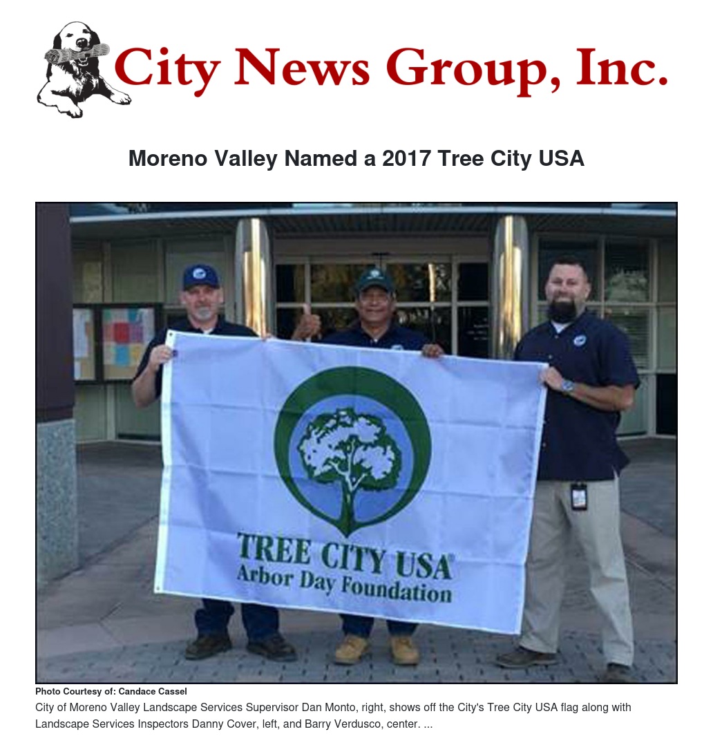 Moreno Valley has been named a 2017 Tree City USA by the Arbor Day Foundation, honoring the City’s commitment to community forestry practices.