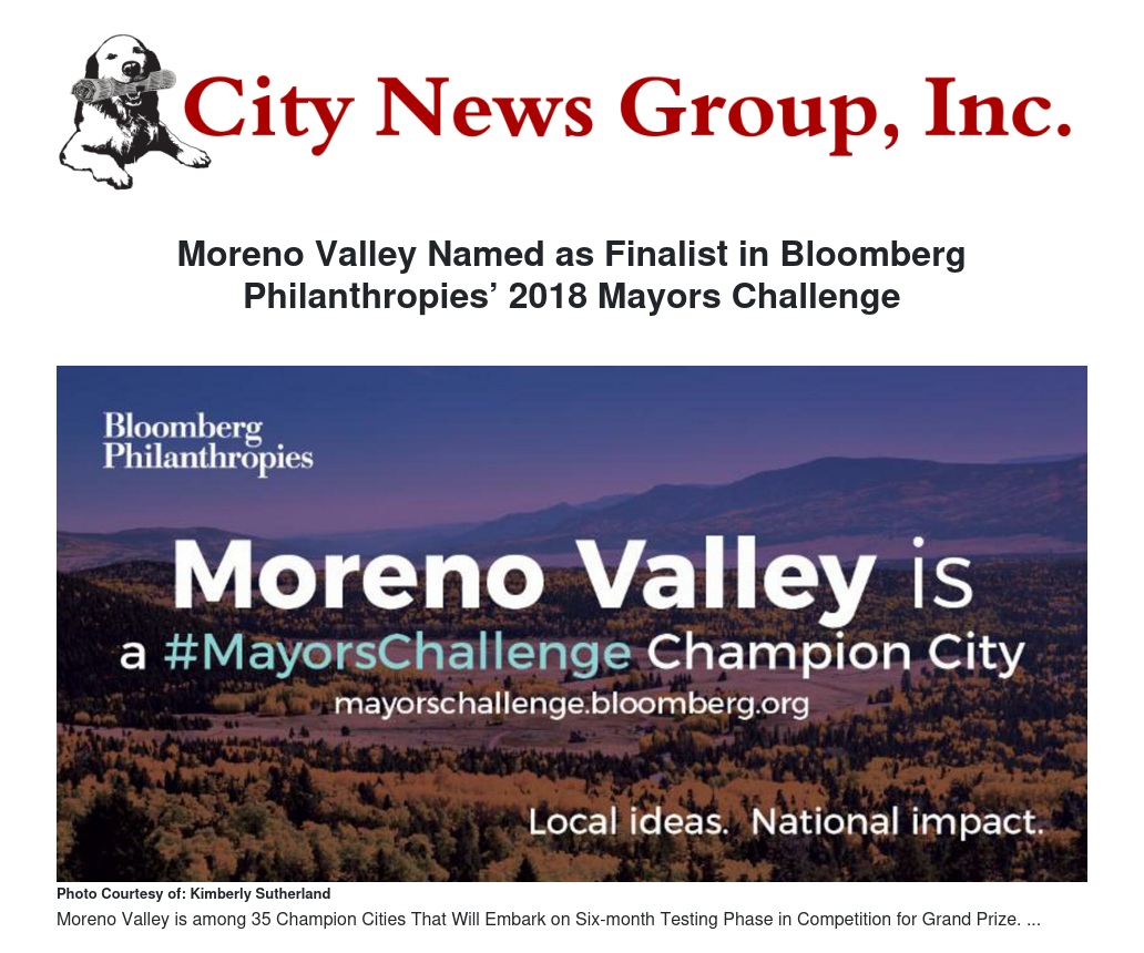 The City of Moreno Valley is one of 35 Champion Cities selected today as finalists in the 2018 U.S. Mayors Challenge, a nationwide competition that encourages city leaders to uncover bold, inventive ideas that confront the toughest problems cities face. These 35 urban innovations rose to the top of a competitive pool of more than 320 applications. The Champion Cities will now begin a 6-month testing phase where they will conduct public prototypes of their ideas with grant funding of up to $100,000 per city, a new addition to the Competition this year. The Mayors Challenge returns to the U.S. as one of the first investments in the American Cities Initiative, a suite of new and expanded programs that will empower cities to generate innovation and advance policy.