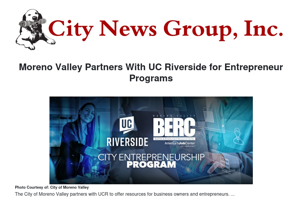 The City of Moreno Valley is proud to announce a partnership with the University of California, Riverside, to provide entrepreneurial workshops and services to the Moreno Valley community.
