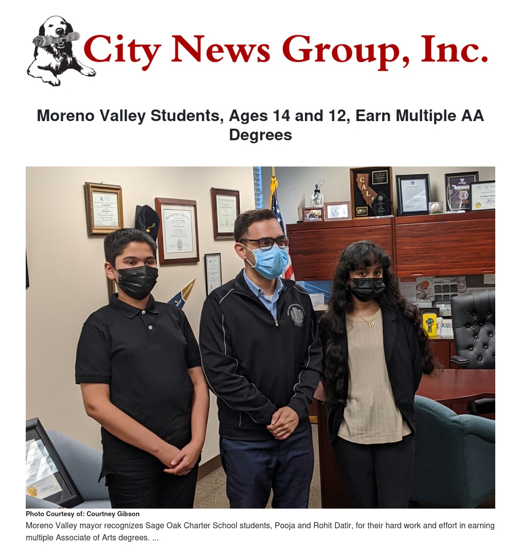 Both siblings are petitioning to earn a total of four AA degrees on their transcripts by August 2021 when they will be eligible to earn additional AAs in Health Science and Health Profession. The Datirs attend Sage Oak Charter Schools where personalized learning plans for students are a top priority. Rahul and Priti Datir, the siblings’ parents, send a special thank you to the Sage Oak staff for their outstanding support and flexibility that allowed their children the ability to focus on both college courses and high school curriculum simultaneously.