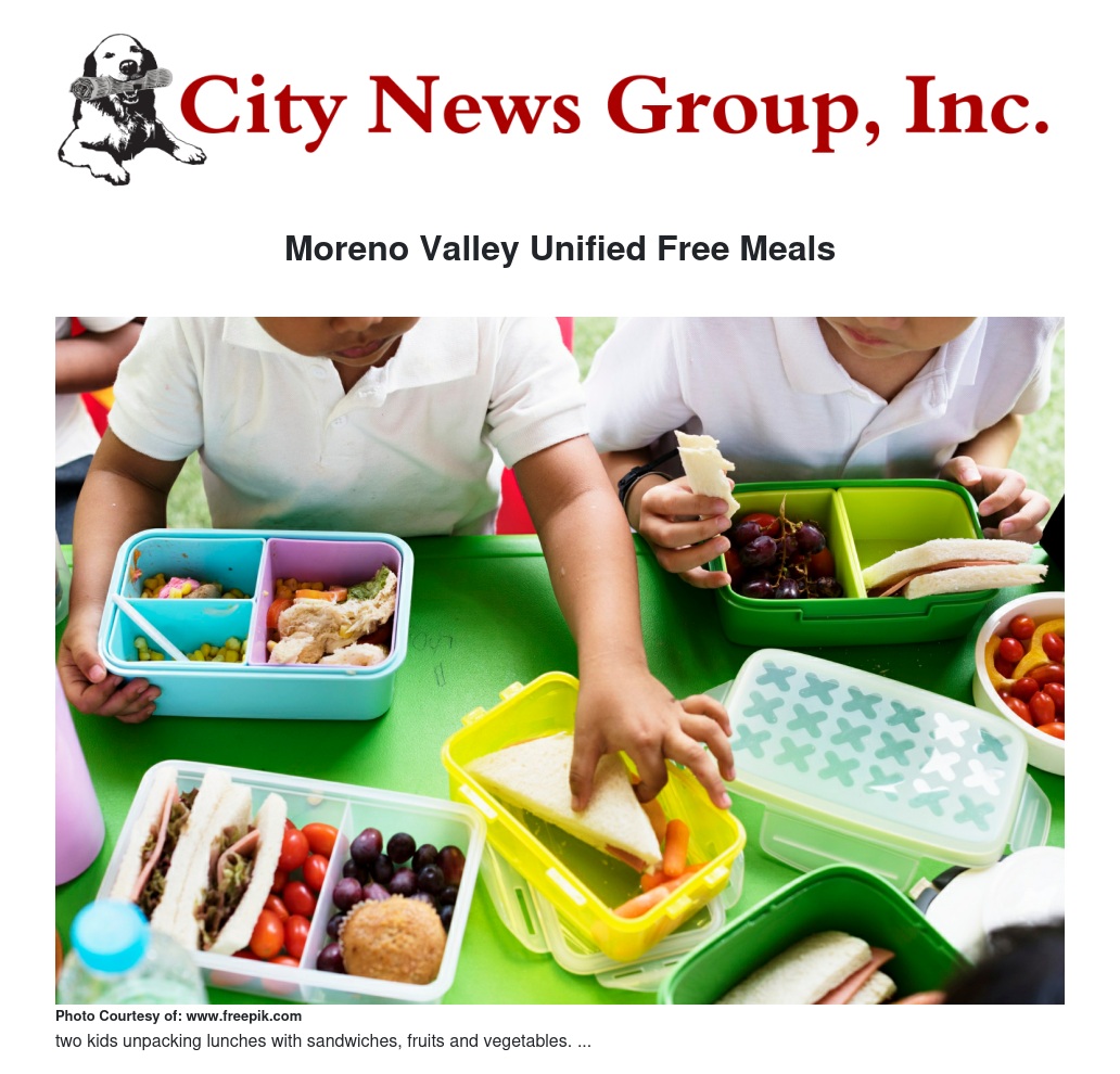 All K-12 students will be served a healthy lunch and breakfast at no charge under the California Universal Meals Program at the following sites: Alessandro Armada Elementary Bridges Learning Center/Bayside Comm. Day Bear Valley Elementary Serrano Elementary Box Springs Elementary Sugar Hill Elementary Butterfield Elementary Sunnymead Elementary Chaparral Hills Elementary Sunnymeadows Elementary Cloverdale Elementary Towngate Elementary Creekside Elementary Rainbow Springs Early Intervention Edgemont Elementary Badger Springs Middle Hendrick Ranch Elementary Landmark Middle Hidden Springs Elementary Mountain View Middle Honey Hollow Elementary Palm Middle La Jolla Elementary Sunnymead Middle Midland Elementary Vista Heights Middle Moreno Elementary Canyon Springs High School Northridge Elementary Moreno Valley High School Ramona Elementary Valley View High School Ridge Crest Elementary Vista Del Lago High School Seneca Elementary March Mountain/March Valley