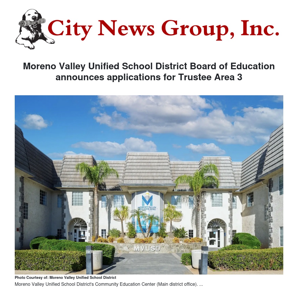 The Moreno Valley Unified School District Board of Education will interview applicants during a special board meeting on Wednesday, February 25, 2026, tentatively starting at 5:00 p.m. The interviews will be open to the public. The Board of Education plans to appoint the new member at that special meeting on February 25, 2026 and the appointee will be sworn in at the March 10, 2026 regular board of education meeting.