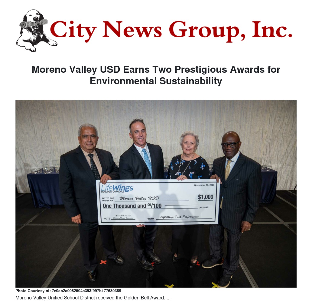 Moreno Valley, Calif. - The Moreno Valley Unified School District received a prestigious Golden Bell Award and Climate Change Innovation Award on November 30, 2023, for its commitment to the environmental sustainability program.