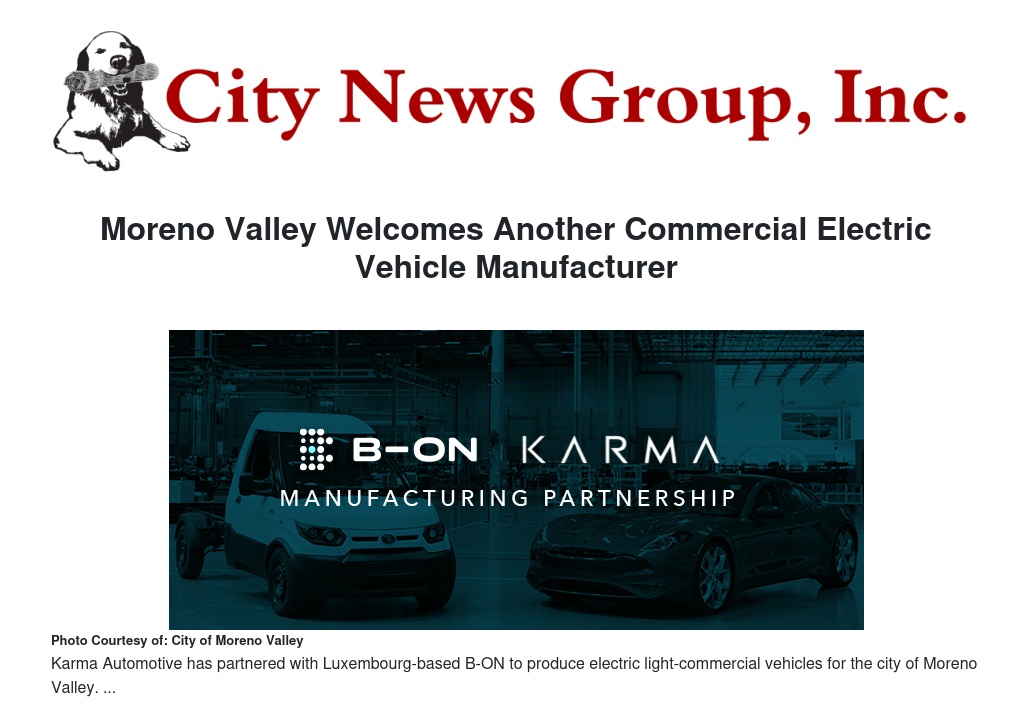 The City of Moreno Valley continues to lead the way in cutting-edge electric vehicle production. Karma Automotive, one of the nation’s premier electric luxury car manufacturers, has partnered with Luxembourg-based B-ON to produce electric light-commercial vehicles at their Moreno Valley facility.