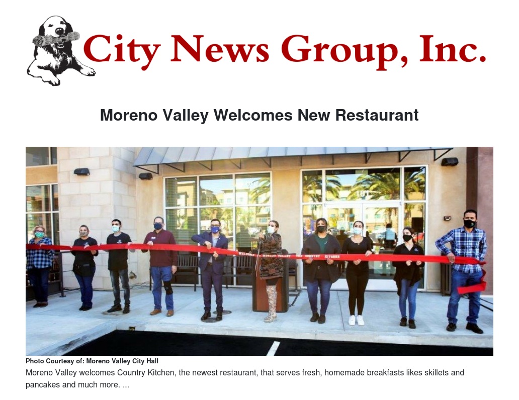 Options for Moreno Valley diners have expanded with the grand opening of the City's newest restaurant, Country Kitchen, located at 12980 Day St Suite 101 in The Quarter, MoVal's award-winning new commercial development at the northeast corner of Day and Eucalyptus. What was once a concrete batch plant has been transformed into a marquee commercial project anchored by two hotels, retail shops and a variety of restaurants.