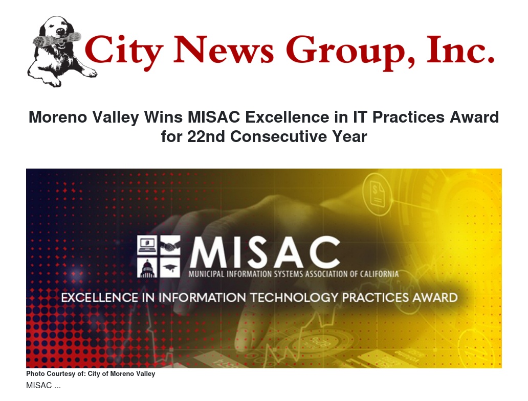 The City of Moreno Valley has been honored with the prestigious Excellence in Information Technology Practices Award by the Municipal Information Systems Association of California (MISAC) for the 22nd year in a row.