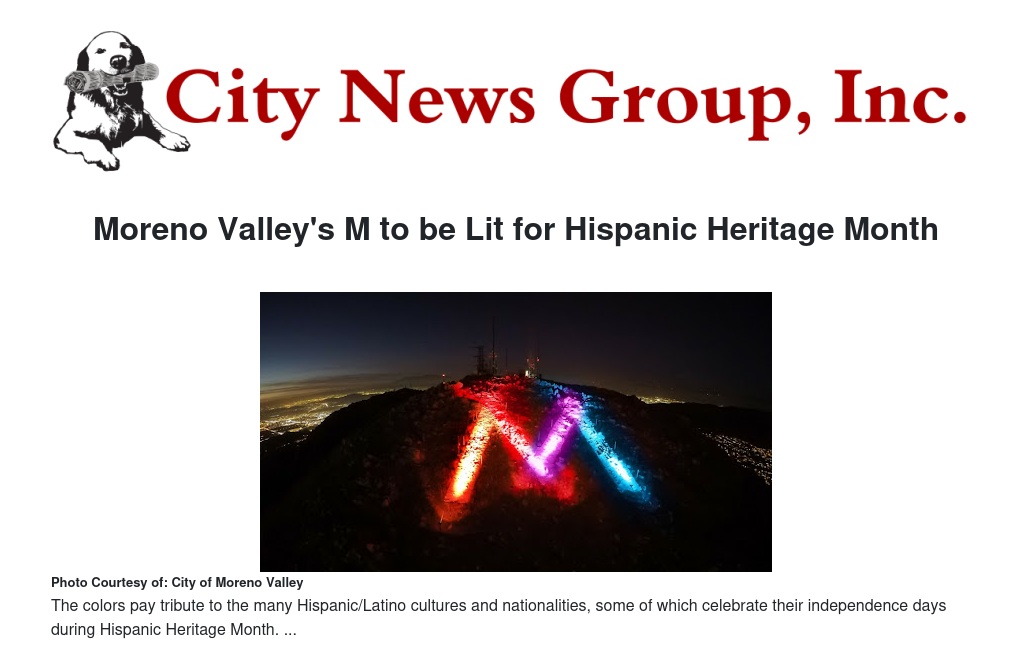Moreno Valley's iconic M on Box Springs Mountain will be lit red, orange, purple, blue, and green in an alternating format on Thursday, September 16 to commemorate the start of Hispanic Heritage Month.