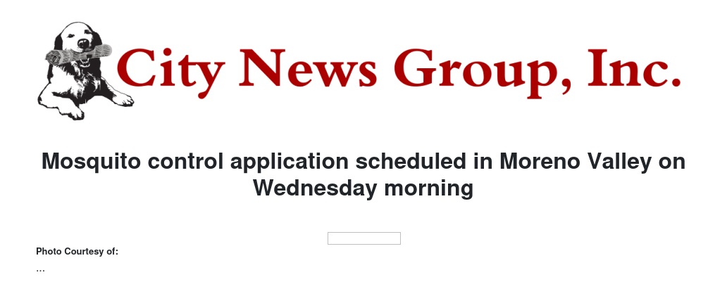 Due to recent positive West Nile virus mosquito test sample results, the Riverside County Vector Control Program has scheduled an ultra-low volume ground application using truck-mounted sprayers to reduce the number of adult mosquitoes. The treatment occured within the city of Moreno Valley, near Heacock Street and Parkland Avenue, in the morning hours of Wednesday, October 25, 2023.