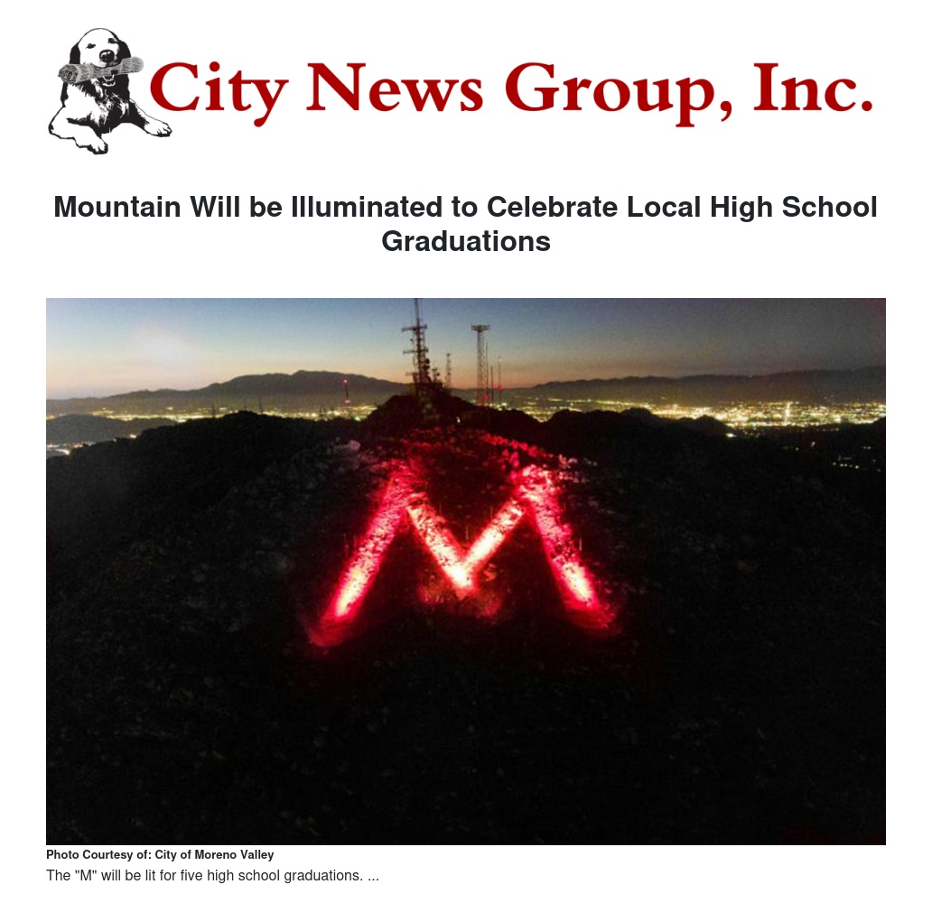 The "M" on Box Springs Mountain will be illuminated to celebrate local high school graduations. The M will be lit up in the colors of each high school on the night of that school's graduation from dusk until midnight.