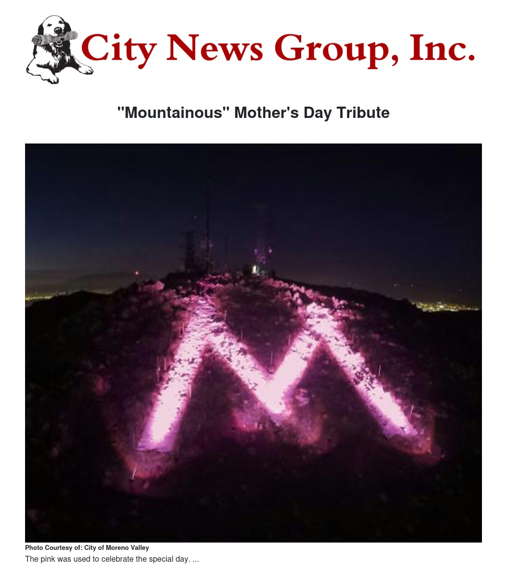 The "M" on Box Springs Mountain was illuminated with pink lights from dusk until midnight on Sunday in recognition of Mother's Day.