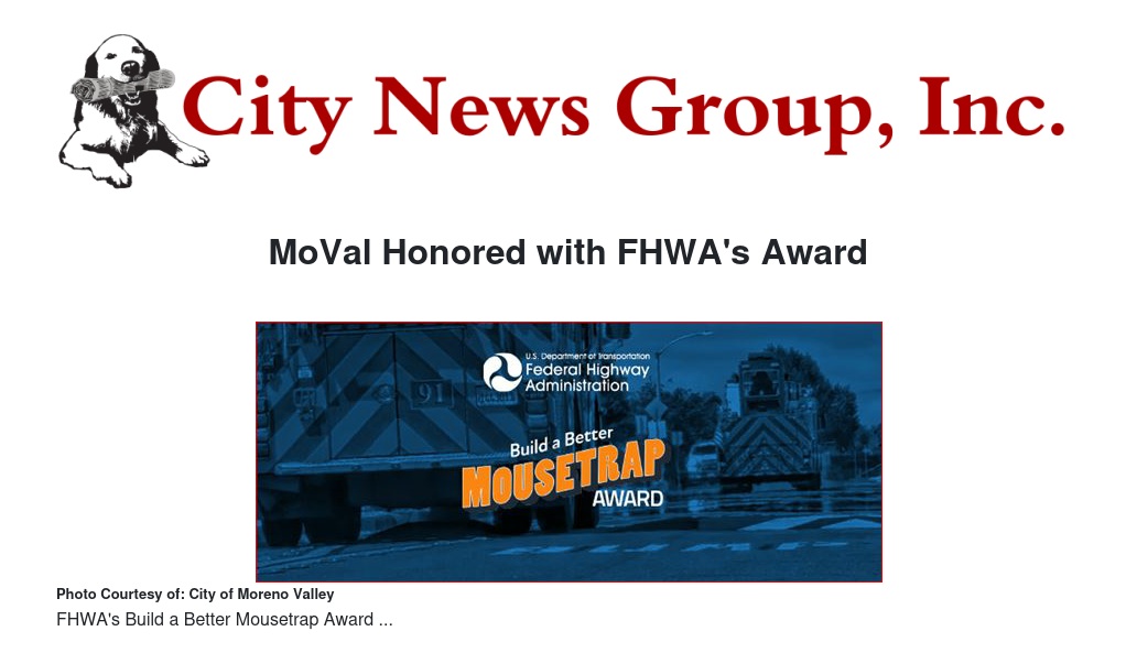 The City of Moreno Valley has been awarded the Build a Better Mousetrap (BABM) Award by the U.S. Department of Transportation's Federal Highway Administration (FHWA) for its innovative speed cushion project. This award recognizes local agencies that use innovative solutions to address transportation challenges.