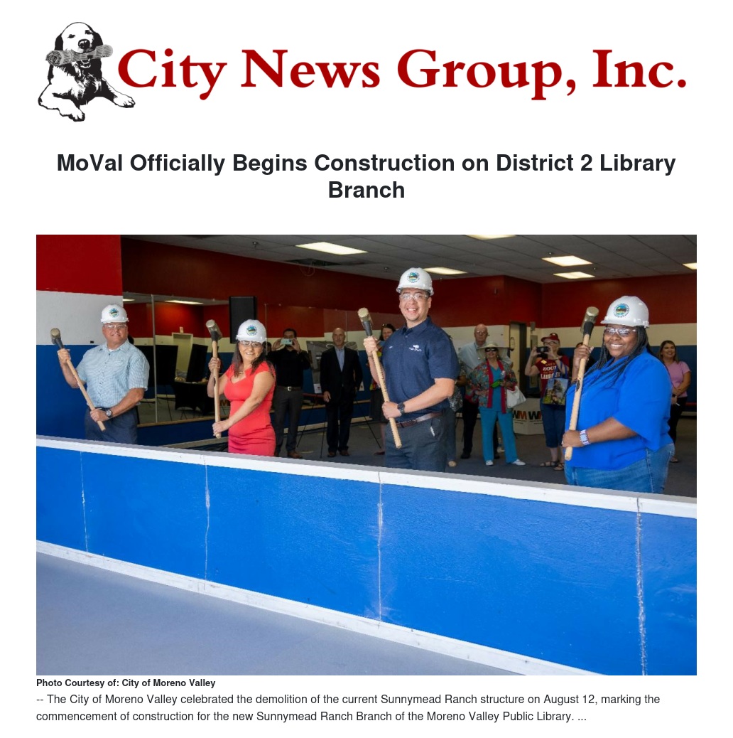 The City of Moreno Valley celebrated the demolition of the current Sunnymead Ranch structure on August 12, marking the commencement of construction for the new Sunnymead Ranch Branch of the Moreno Valley Public Library.