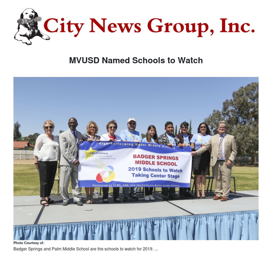 During a ceremony recently, the Moreno Valley Unified School District was named a National Schools to Watch District, becoming one of only 20 districts in the nation with the designation. The recognition comes after Badger Springs and Palm Middle Schools earned their National Schools to Watch status, making all six MVUSD middle schools National Schools to Watch.