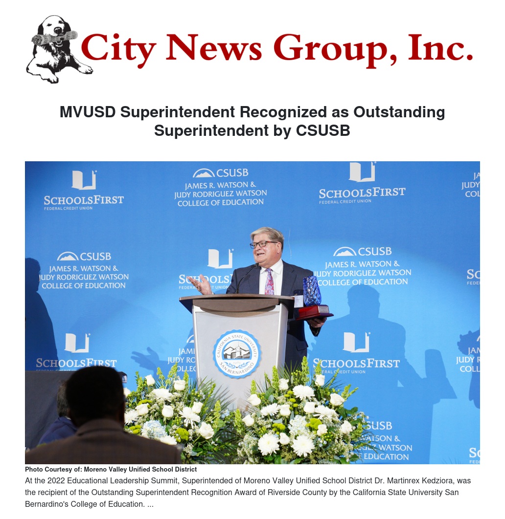 The California State University San Bernardino’s College of Education announced Superintendent Dr. Martinrex Kedziora as a recipient of the Outstanding Superintendent Recognition Award of Riverside County at its 2022 Educational Leadership Summit. He was selected for his service and dedication to excellence in education while serving as Superintendent of Moreno Valley Unified School District.