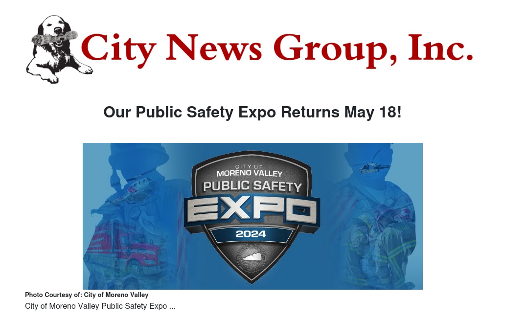 The Public Safety Expo will take place on Saturday, May 18, from 10 a.m. to 2 p.m. along Calle San Juan de Los Lagos at the Moreno Valley Civic Center.