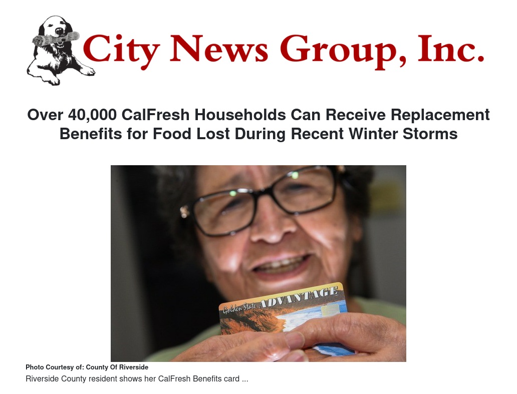 Over 40,000 CalFresh Households Can Receive Replacement Benefits for Food Lost During Recent Winter Storms by County of Riverside - City News Group, Inc.
