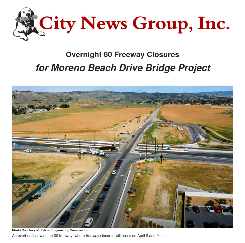 As part of the ongoing Moreno Beach Drive bridge project, portions of the 60 freeway are scheduled to be closed during the nights of Friday, April 8, and Saturday, April 9.