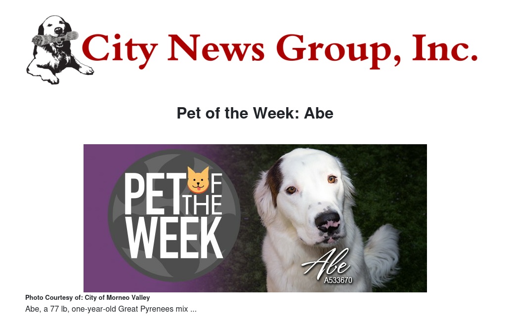 If you would like to make Abe or any pet from the Moreno Valley Animal Shelter part of your family, please contact the Moreno Valley Animal Shelter at 951.413.3790 or visit www.moval.org/pets