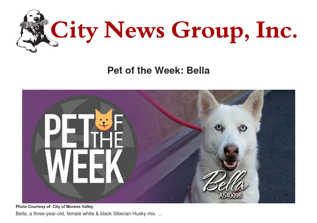 If you would like to make Bella or any pet from the Moreno Valley Animal Shelter part of your family, please contact the Moreno Valley Animal Shelter at 951.413.3790 or visit www.moval.org/pets. |