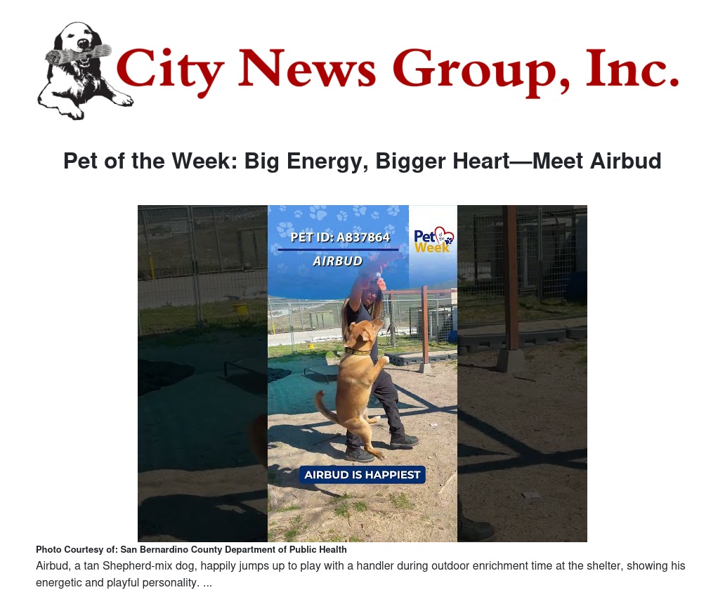 You can meet Airbud in person at the Devore Animal Shelter during a meet-and-greet to see if you’re the perfect match.