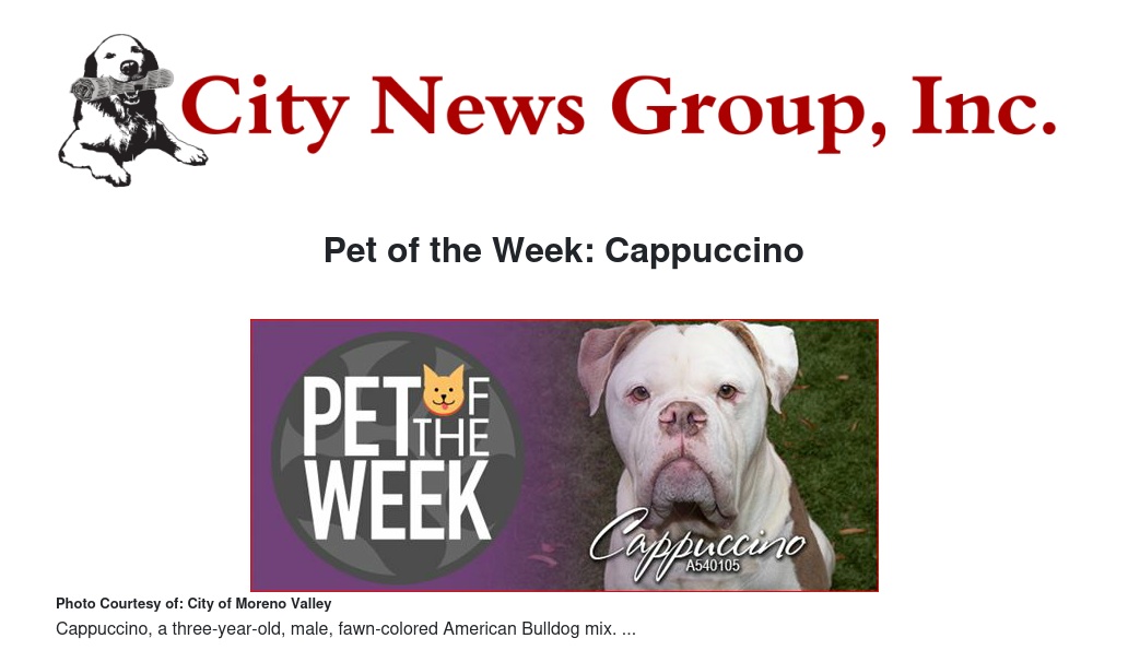 If you would like to make Cappuccino or any pet from the Moreno Valley Animal Shelter part of your family, please contact the Moreno Valley Animal Shelter at 951.413.3790 or visit www.moval.org/pets