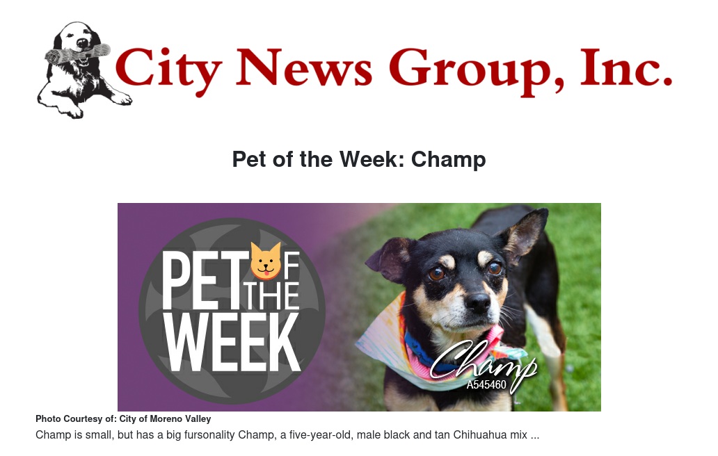 If you would like to make Champ, or any pet from the Moreno Valley Animal Shelter, part of your family, please call 951.413.3790 or visit moval.org/pets.
